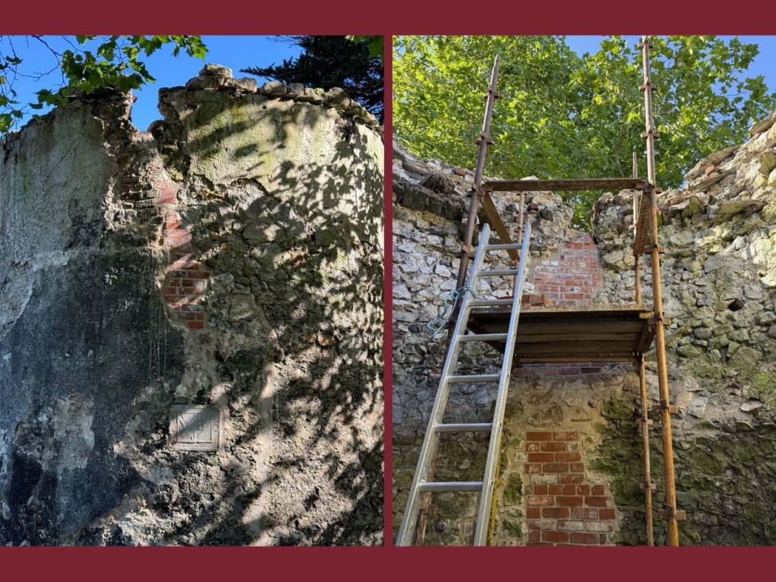 The stabilisation of our North West Bawn Wall Turret is nearing completion. Fresh lime mortar and new brick work has been applied to stabilise and strengthen the condition of the turret, allowing it to stand for years to come. Many people ask why modern bricks are used instead of old stone. The aim of this conservation work is not to replicate the original construction of the turret but rather to secure as much of the original as possible. For future generations, it is important for us to show a clear difference between the original structure and any interventions that we have made this year. The bricks will be concealed beneath lime but any future conservators will clearly be able to distinguish between 16th century stone and 21st century bricks.